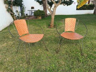 Set de dos sillas bajas de diseño (únicas) con asiento y respaldo de cuero. - Estructura metálica. - Diseño moderno y elegante. - Materiales de calidad. Se entregan en zona San Pedro Alcántara (Marbella).