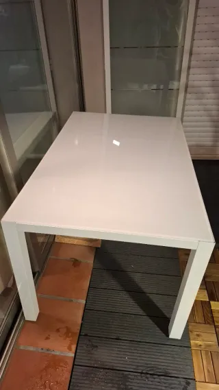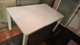 Conjunto de mesa de comedor ikea con cuatro sillas de diseño clasico. La mesa tiene uso, tiene algunas manchas en la parte superior, y patas con alguna ralladas, ver las fotos. Mesa sin extender 130x90 com Mesa extendida 190×90 cm Alturas patas 14 cm Las sillas son con estructura de madera completa, asientos tapizados en piel y remaches.Restauradas, haria falta otra mano de pintura. Sillas de tamaño grande 40×44×104cm Venir a recoger en Sant Llorenç d'Hortons.