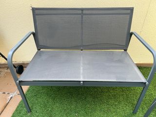 Conjunto de mobiliario para terraza o jardín. - Incluye una mesa, dos sillas y un sillon - Estructura de metal. - Superficie de cristal en la mesa. - Asientos de tela. Se DESMONTA TODO. Fácil transporte El sillon tiene un pequeño agujero Las sillas miden 56 x 63 x 81 cm, el banco 103 x 63 x 81 cm y la mesa 75 x 45 x39,5 cm,
