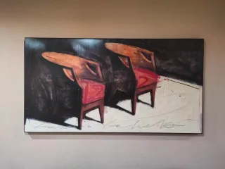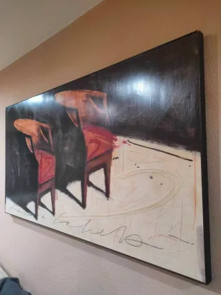 Cuadro abstracto sillas madera y tela