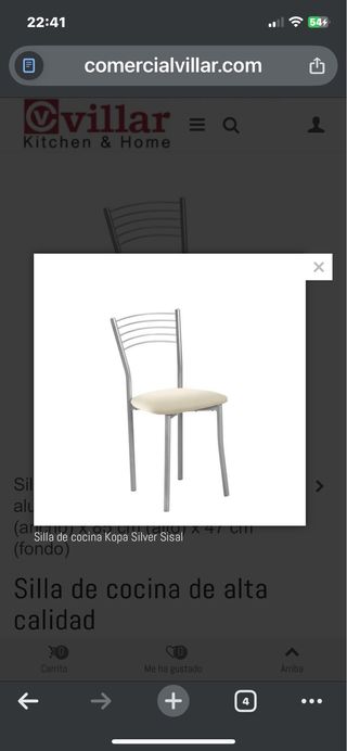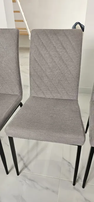 .Conjunto de cuatro sillas de comedor tapizadas en tela. - Diseño moderno con patas metálicas. - Respaldo con detalle acolchado. - Asiento cómodo y acolchado. No se venden por separado. Tienen 1 año y medio. Están muy bien cuidadas, no tienen manchas y me costaron 75€ cada silla. Se venden por cambio de estilo.