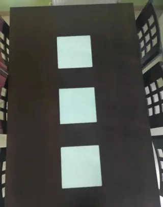 Mesa de comedor extensible, y 4 sillas nuevas. La mesa es de 120cm x 90 cm, pero se extiende fácilmente a 220 cm, pudiendo pasar de 6 a 8/10 comensales en un momento. La estructura de de madera y tapa de cristal, muy robusta. Además, se incluyen 4 sillas nuevas. La mesa tiene un pequeño defecto en el tintado del cristal, pero que prácticamente no se aprecia. Ahora se cubre con cualquier adorno, como ves en la foto. Además, lleva una tapa de cristal templado de regalo. Solo el cristal ya vale una pasta. La vendemos por cambio de decoración, y está impecable. Mira además las estanterías de mi perfil, y te hago precio por todo.