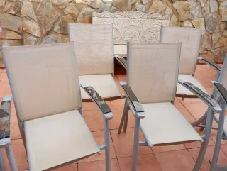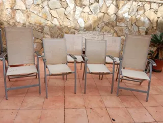 RECOGIDA EN PERSONA. Conjunto de seis sillas de exterior, perfectas para tu terraza o jardín. Incluye cuatro sillas apilables y dos sillas reclinables para mayor comodidad ( una de las reclinables, está con defecto). ( Se puede ver el defecto en las fotos). - Estructura de metal resistente. - Asientos y respaldos de tela. - Diseño moderno en tonos beige y gris.