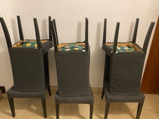 Conjunto de seis sillas modelo Henriksdal de Ikea. Son cómodas y elegantes, y robustas. Alguna con el asiento algo hundido, pero funcional aun. Perfectas para cualquier comedor. Mejor ver. - Patas de madera oscura. - Tapicería de tela gris, lavable, en perfecto estado. - Diseño moderno y funcional. 80€ las seis sillas.
