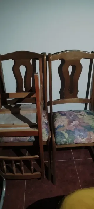 Conjunto de sillas de comedor con un diseño clásico y asientos tapizados. - Estructura de madera resistente. - Tapicería con estampado floral multicolor Sillas buenas. Aguantan bastante Precio por silla,si te llevas todas se hace precio Urge venta