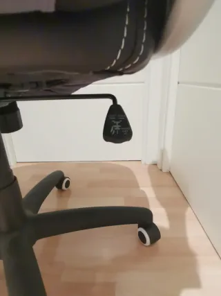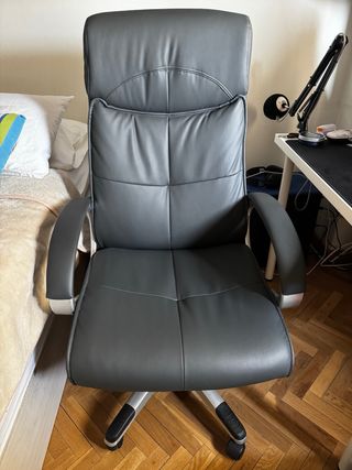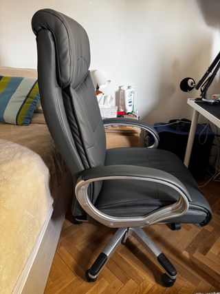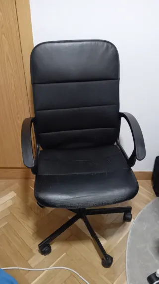 Silla de oficina con diseño ergonómico para mayor comodidad. - Respaldo ajustable. - Asiento acolchado. - Base giratoria. Tiene un desgaste evidente de la polipiel en la zona del asiento. De ahí que lleve la funda. Aún así sigue siendo muy cómoda y funciona perfectamente.