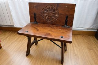Banco antiguo de estilo rústico, fabricado en madera maciza con un diseño tallado en el respaldo. - Respaldo con detalle floral tallado. - Bisagras metálicas decorativas. - Estructura robusta de madera. Medidas: • Ancho: 60 cm • Fondo abierto: 70 cm En muy buen estado de conservación, Presenta leves marcas superficiales propias del uso y del paso del tiempo, que no afectan a su estabilidad ni funcionalidad (ver fotos). Recogida en Alcalá de Henares. Precio negociable si recogida rápida.