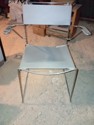 Elegante silla de diseño con una estructura metálica y detalles en cuero. Se entrega en Villamantilla - Acabado en color gris y plateado. - Materiales de alta calidad.