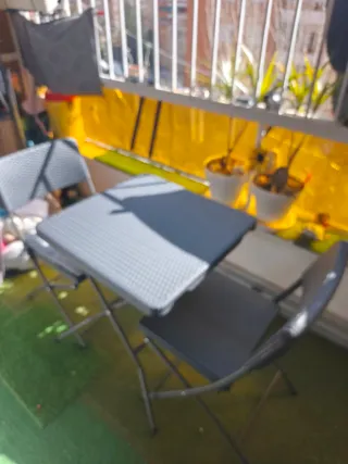 Conjunto de mesa y dos sillas plegables, perfecto para tu terraza o balcón. Fácil de guardar y transportar. - Estructura metálica. - Tablero y asientos de plástico.