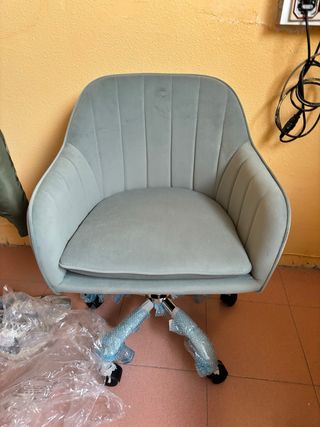 Silla de oficina con un diseño moderno y cómodo. - Tapizado en terciopelo suave. - Base de metal y plástico con ruedas. - Respaldo acanalado para mayor confort.