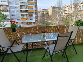 Conjunto de mesa y cuatro sillas perfecto para tu jardín o terraza. Ideal para disfrutar del aire libre. - Estructura de metal. - Asientos y respaldo de tela. - Tablero de vidrio - Sillas apilables Perfecto estado. Conservados en terraza interior , mesa siempre con mantel . Muy comodos y buena calidad . Dimesiones mesa : 90cm ancho x 160 largo x 74 alto. Precio original en el corte ingles por 950 euros Recoger en Mostoles