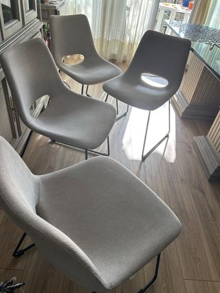 Conjunto de cuatro sillas de comedor con un diseño moderno y elegante. Perfectas para dar un toque contemporáneo a tu hogar. 60€ las cuatro sillas Altura 45 cm y respaldo 95 cm - Tapicería en tela gris. - Estructura metálica. - Patas y detalles en cristal.