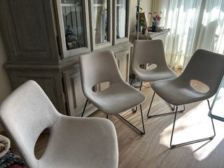 Conjunto de cuatro sillas de comedor o salón, en color gris y tapizadas en tela. Están en perfecto estado, como nuevas. - Diseño moderno y elegante. - Patas metálicas resistentes.
