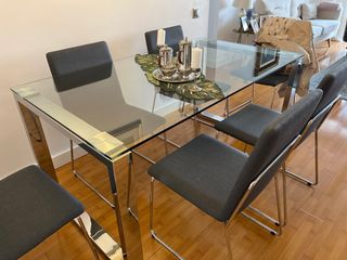Elegante comedor con mesa de cristal y seis sillas tapizadas en piel sintética negra. Ideal para dar un toque moderno a tu hogar. - Mesa con estructura metálica cromada. - Sillas con diseño ergonómico.