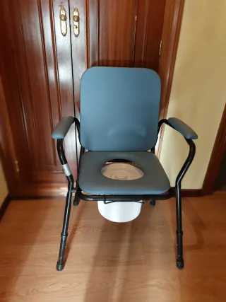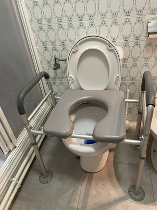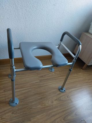 Silla ortopédica para WC en muy buen estado, apenas uso. Estructura de aluminio resistente y ligera, con asiento acolchado y apertura para facilitar la higiene. Altura regulable y reposabrazos acolchados para mayor comodidad y seguridad. Conteras antideslizantes para mayor estabilidad. Ideal para personas mayores, recuperación tras operación o movilidad reducida. Recogida en Alcalá de Henares.