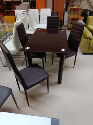 Conjunto de mesa de comedor con un diseño moderno y elegante, acompañado de cuatro sillas. - Mesa con sobre de cristal templado. - Sillas con tapicería de piel sintética. - Estructura de metal.