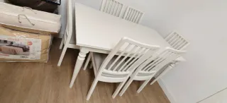 Conjunto de mesa y seis sillas de madera en acabado blanco. La mesa se expande hasta ocho plazas. Todo está prácticamente nuevo, se ha usado poco y con cuidado. Un chollo.