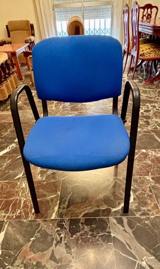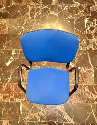 Silla de escritorio con asiento y respaldo tapizados en tela azul. - Estructura metálica. - Diseño moderno y funcional.