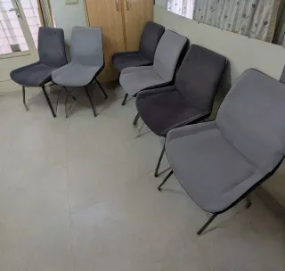 Conjunto de sillas de oficina con estructura de cuatro patas. - Tapicería de tela. - Patas y estructura metálica. - Respaldo de malla. Disponemos de 16 sillas iguales a 35 eur cada una