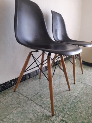 Se venden dos sillas icónicas de diseño. - Asientos de plástico negro. - Patas de madera estilo Eames.