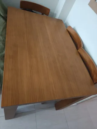Conjunto de mesa de comedor con un diseño rústico y cuatro sillas a juego. - Mesa de madera maciza. - Sillas a juego Dimensiones. 120 cm de largo y 80 cm de ancho. Ampliada 198 cm. A recoger en Calle Cartagena de Murcia.