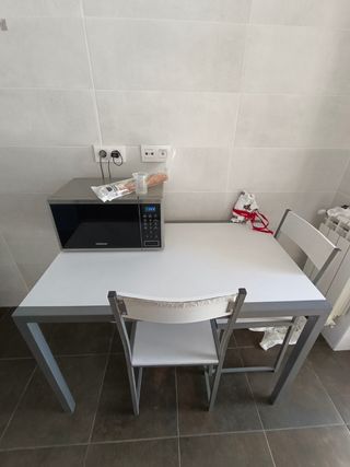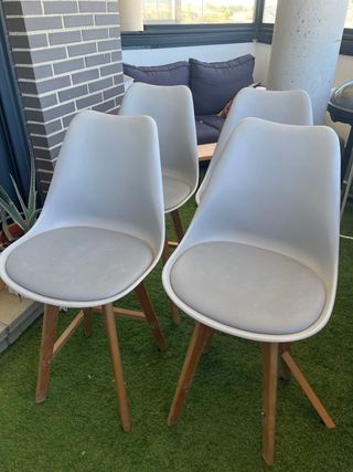 Se venden cuatro sillas blancas y cuatro cojines para los asientos en color gris. Son de metal y plástico, y se encuentran en buen estado. - Ideales para comedor o cocina. - Diseño sencillo y elegante. - Fáciles de limpiar. - Muy cómodas. - Ocupan muy poco espacio.