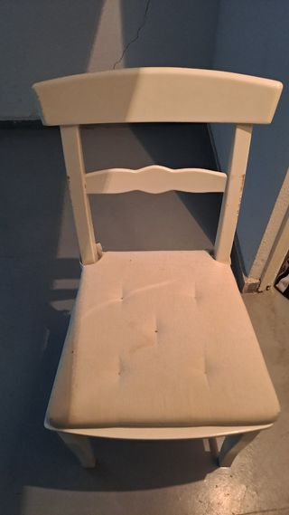 Conjunto de cuatro sillas de comedor por 15€ las 4. Estructura de madera pintada a mano en blanco mate. Asiento tapizado en tela gris en perfecto estado. La estructura esta en buen estado pero hace falta reforzar y pegar de nuevo una de las sillas por el paso del tiempo esta mas inestable.