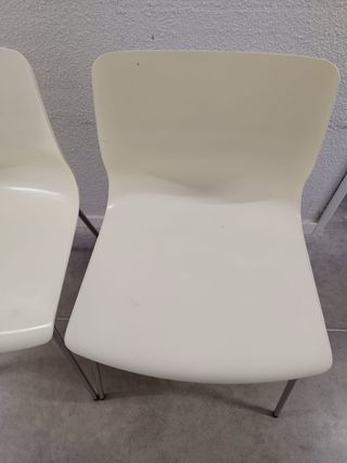 Conjunto de cuatro sillas con un diseño moderno y elegante. - Asientos de plástico blanco. - Patas de metal plateado. Ver en foto el estado. A una le falta en una pata la goma.