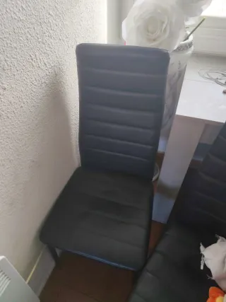 Se venden cuatro sillas de comedor con un diseño moderno y elegante. Son perfectas para cualquier espacio. - Tapicería color negra de cuero - Diseño con líneas horizontales en el respaldo.