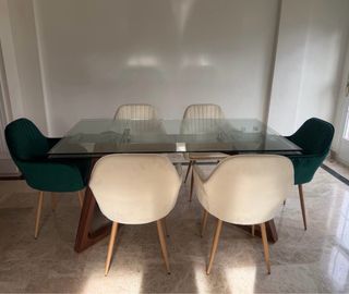 Se venden las 6 sillas , oportunidad unica , estan nuevas , recien compradas , enseñamos la factura , las vendemos porque no nos combina con el salon , estan totalmente nuevas y sin usar , se las podemos acercar a casa si viven en salamanca o proximidad. Altura total: 87 cm. Ancho del asiento: 56 cm. Profundidad asiento: 44 cm. Altura hasta el asiento: 43 cm. Altura hasta el brazo: 65 cm. Altura del respaldo: 44 cm. Altura de las Patas: 41 cm. Ancho de las Patas: 41 cm. Peso: 7 kg. Material del asiento: Te - Diseño moderno y elegante. - Sillas tapizadas en terciopelo. - Patas de madera. - Combinación de sillas en verde y beige.