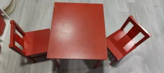 Conjunto de mesa y dos sillas infantiles de IKEA. El conjunto ha sido muy utilizado pero aún tiene mucha vida. - Diseño clásico. - Color rojo.