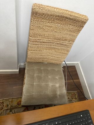 4 Elegantes sillas de comedor con un diseño natural y acogedor. Precio negociable. Los cojines vienen incluidos aunque hayan comprado aparte. En buenas condiciones - Estructura principal de yute tejido. - Patas de madera oscura. - Cojín de asiento acolchado en tono beige.