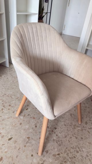 Precio unidad, dispongo 3 unidades. No se han usado. Se vende con funda blanca.Conjunto de sillas tapizadas en terciopelo de color beige. Su diseño moderno y elegante las hace perfectas para cualquier espacio.