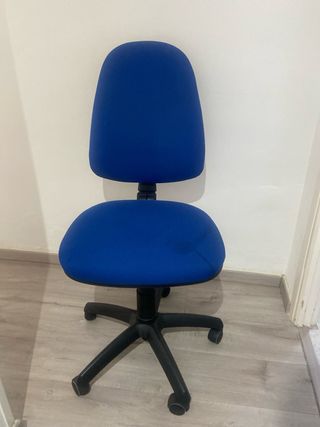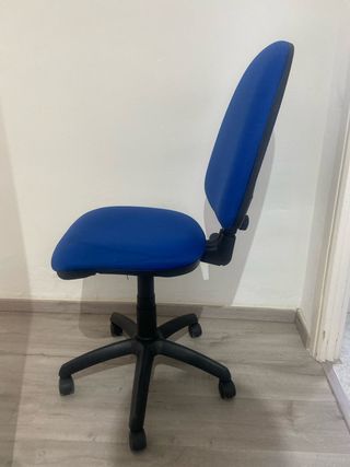 Silla de escritorio con un diseño moderno y funcional. - Base de cinco patas con ruedas para facilitar el movimiento. - Asiento y respaldo tapizados en tela azul. - Mecanismo de ajuste de altura.