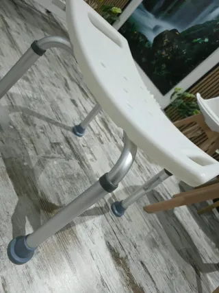 Silla de ducha con estructura metálica y asiento de plástico. - Patas ajustables en altura. - Asiento con orificios para drenaje. - Diseño ergonómico.