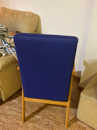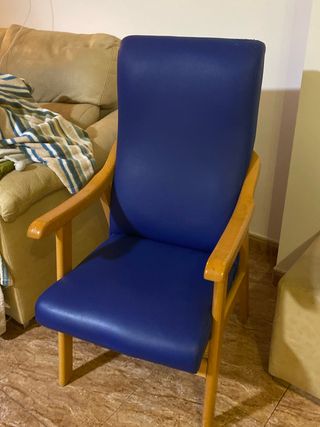 Silla cómoda con un diseño moderno. - Tapicería en piel sintética azul. - Patas y reposabrazos de madera.