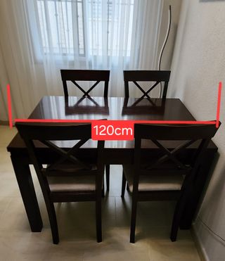 Conjunto de mesa extensible con cuatro sillas tapizadas. La mesa tiene una medida de 80cm de ancho y se puede extender hasta 170cm. Conjunto en madera maciza de mesa extensible y 4 sillas tapizadas. No se envia, solo entrega en mano. Puede combinarse con otros muebles publicados en otro anuncio. Ver en https://es.wallapop.com/item/muebles-salon-mueble-bajo-tv-consola-armario-1237794173 - Mesa extensible. - Incluye 4 sillas tapizadas.