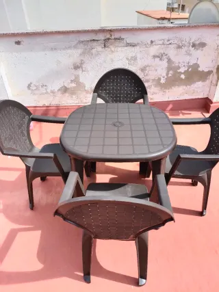 Conjunto de mesa y cuatro sillas para jardín o terraza. Ideal para disfrutar del aire libre. - Mesa de forma cuadrada. - Sillas con diseño moderno y cómodo. Siempre en terraza no a la intemperie 682508162 para hablar por WhatsApp