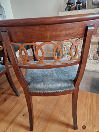 Se venden 6 sillas con tapizado sky y estructura de madera. - Diseño moderno y elegante. - Asiento y respaldo cómodos. - Patas de madera oscura. - Poco uso - Se cambia él mobiliario