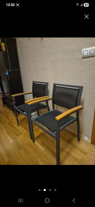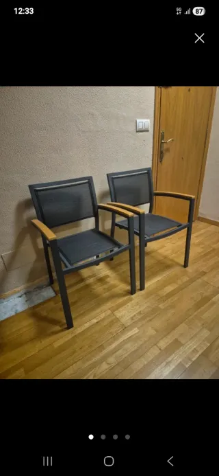 Conjunto de sillas de exterior con estructura aluminio y asiento de loneta. - Diseño moderno. - Perfectas para terraza o jardín. - Combinación de colores neutros. - 14 unidades disponibles - venta por juego de - 2 unds - 60€ - 4 unds - 110€ - Todas mejoramos precio - 14 unds disponibles Mas informacion Mv: 640 887028 Interesados consultar Visita sin compromiso previa cita Precio algo negociable Solo Recoger no se envia Mesas Sillas Butacas