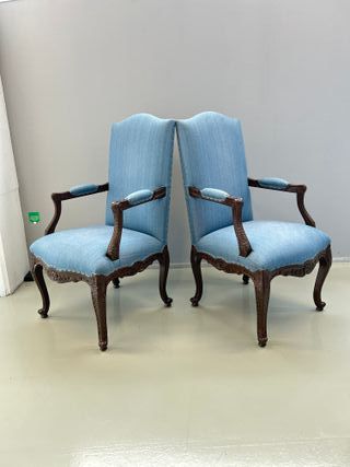 Elegantes sillas estilo Luis XV, perfectas para añadir un toque de distinción a tu hogar. En madera tallada con decoración vegetal. Tapicería color azul . Perfecto estado. - Tapicería en tela de color azul. - Estructura de madera tallada. - Diseño de respaldo alto. Precio por unidad. 2 unidades disponibles Ancho 62 x Fondo asiento 50 xFondo 70 x Alto asiento 52x Alto 115 Esta pieza forma parte del vaciado de un yate de lujo de 63m de eslora. Prácticamente sin usar.