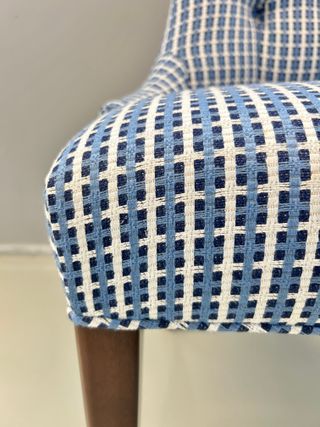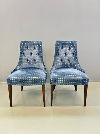 Pareja de sillas tapizadas de la reconocida marca Baker. Modelo A Silla tapizado azul y blanco con abotonado capitoné. Marca mobiliario lujo Baker furniture - Tapicería de tela con estampado de puntos. - Patas de madera oscura. - Respaldo alto con capitoné. Precio por unidad 220 euros Ancho 55x Fondo asiento 43x Fondo 53 x Alto asiento 46 x Alto 93 Estas sillas forman parte del vaciado de un yate de lujo de 63m y 12 habitaciones. Se vacía para renovar la decoración. Prácticamente sin usar.