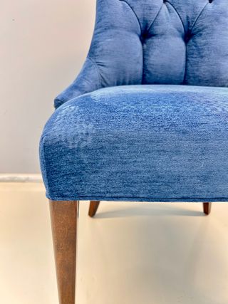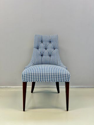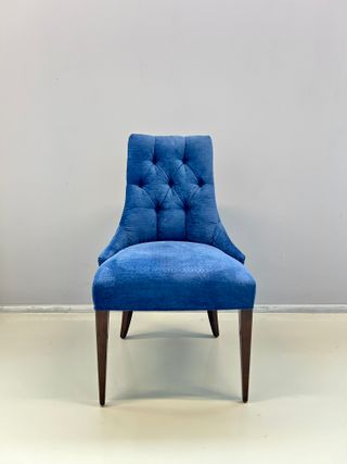 Silla tapizada de la reconocida marca Baker. Silla tapizado azul con abotonado capitoné. Marca mobiliario lujo Baker furniture - Tapicería de tela con estampado. - Patas de madera oscura. - Respaldo alto con capitoné. Ancho 55x Fondo asiento 43x Fondo 53 x Alto asiento 46 x Alto 93 Estas sillas forman parte del vaciado de un yate de lujo de 63m y 12 habitaciones. Se vacía para renovar la decoración. Prácticamente sin usar.