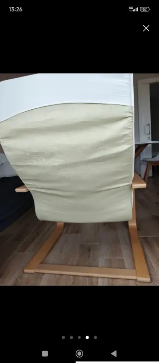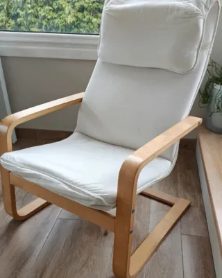 Cómoda silla Poäng con estructura de madera y cojines de tela. - Diseño moderno y ergonómico. - Ideal para relajarse en cualquier estancia - El cojín está bastante sobado.