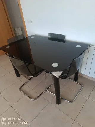 Mesa de comedor con sobre de cristal negro y estructura metálica brillante en perfecto estado. Incluye sillas de cuero reciclado. - Mesa extensible 156 cm con dos extensiones de 50 cm como nueva - Patas metálicas cromadas. - 4 sillas de cuero reciclado color crudo (2 de ellas tienen algun rasguño) Recogida en zona Alt Penedes
