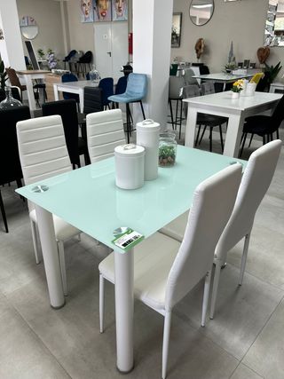 Mesa de comedor de cristal + 4 sillas + 2 butacas Vendo elegante mesa de comedor con encimera de cristal templado y estructura de madera en perfecto estado. Es amplia, estable y encaja muy bien en salones modernos o clásicos. Medidas de la mesa: • Largo: 190 cm • Ancho: 98 cm • Altura: 75 cm Incluye 4 sillas y 2 butacas a juego, con estructura de madera y tapicería en tono claro, cómodas y bien cuidadas. Ideal para familias, espacios amplios o quienes buscan una mesa con presencia y calidad. Estado: Muy buen estado, sin golpes ni desperfectos importantes. Motivo de venta: Cambio de mobiliario.