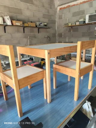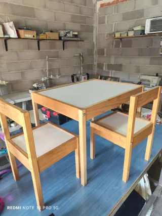 Mesas y sillas que compramos hace 2-3 meses, no las hemos usado, están nuevas como se puede ver. 35€ por todo, PRECIO NO NEGOCIABLE, 35€ es más que justo por todo. Medidas de la mesa: 125cm de ancho, 75cm de alto y 75cm de fondo. Medidas de las sillas: 95cm de alto y 38cm de ancho. Se regalan 4 protectores de las sillas con el precio.