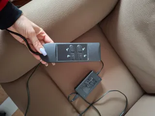 Cómodo sillón reclinable con un diseño moderno. - Tapizado en tela. - Cojín lumbar incluido. - Ajustable con mando - Reposapiés ajustable - Cuenta con inclinacion para facilitar la puesta en pie - Posibilidad de comprar una pareja por 170€ (ultima foto)