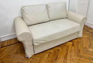 Sofá cama de dos plazas de Ikea. (Descatalogado) - Tapicería de tela y piel. - Color beige y blanco. * Se ven un poco de arrugas por que las fundas están recién lavadas. Recogida en Bilbao junto a San Mames.