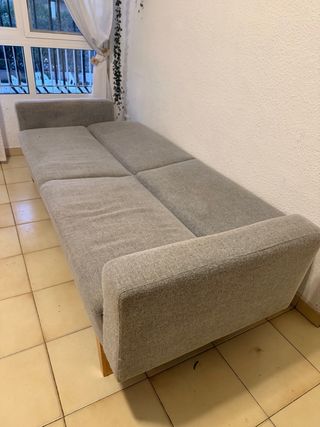 Sofa cama de tela, en color beige. Desplegado tiene unas medidas de 200x95 cm (largo X ancho). Usado solamente durante 6 meses. Incluye funda protectora.
